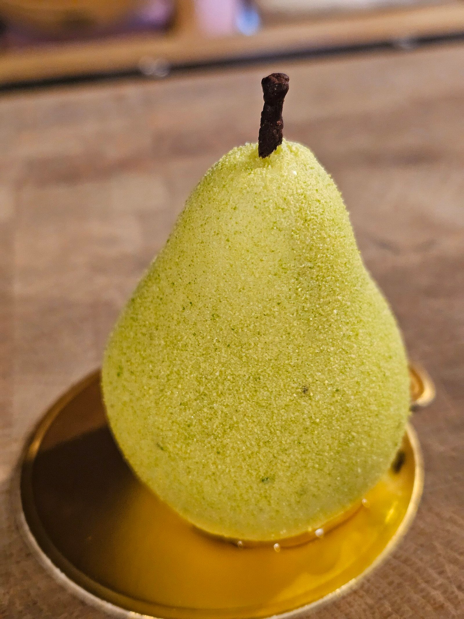 – POIRE : Génoise, Croustillant praliné amande noisette, Insert poire purée et morceaux, Ganache montée vanille pointe de tonka, coque chocolat blanc